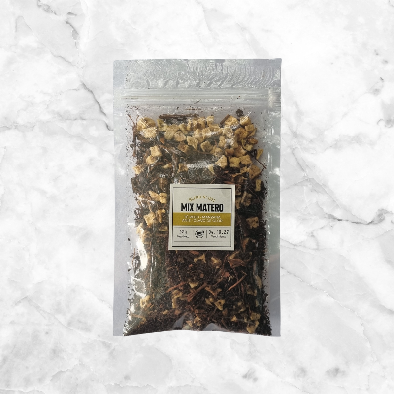 El té rojo (Pu-erh) tiene un perfil terroso, con notas profundas que combinan muy bien con la dulzura y frescura de la manzana deshidratada. Un blend potenciado con especias como el clavo de olor el anís para equilibrar sabores.
